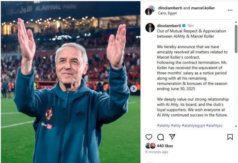 أعلن دينو لامبرتي، وكيل المدرب السويسري مارسيل كولر، التوصل لاتفاق ودي مع إدارة النادي الأهلي يقضي بإنهاء التعاقد بين الطرفين بالتراضي، تقديرًا للعلاقة الاحترافية والراقية التي جمعت كولر بالنادي طوال فترة عمله.