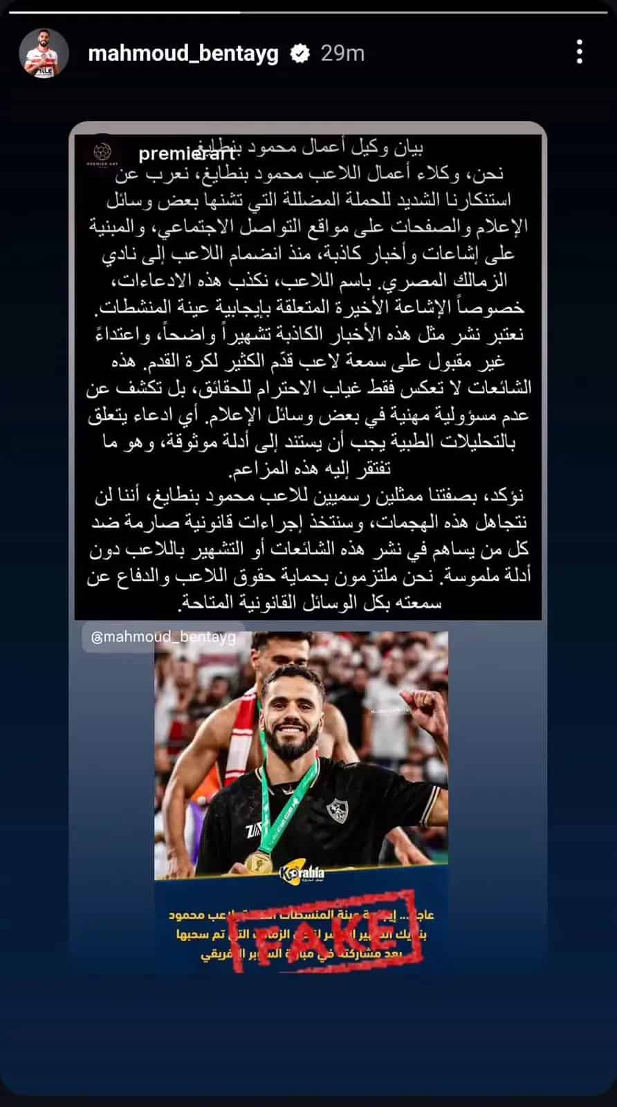 ونشر بنتايك بيان ردًا على تلك التقارير عبر حسابه علي موقع “إنستجرام” وجاء فيه: “نحن وكلاء أعمال اللاعب محمود بنتايك نعرب عن استنكارنا الشديد للحملة المضللة التي تشنها بعض وسائل الإعلام والصفحات على مواقع التواصل الاجتماعي والمبنية على إشاعات وأخبار كاذبة منذ انضمام اللاعب إلى نادي الزمالك المصري”.