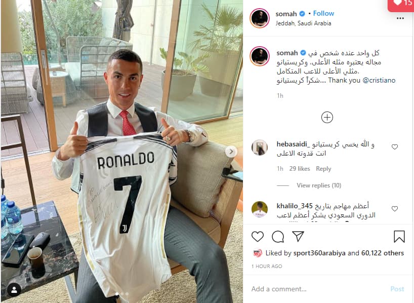 ونشر السومة صورتين عبر حسابه الرسمي “انستجرام” له وللنجم البرتغالي حاملا قميص الأخير مع السيدة العجوز والذي وقع له عليه: “إلى عمر السومة” وعلق السومة قائلا: “كل واحد عنده شخص في مجاله يعتبره مثله الأعلى وكريستيانو مثلي الأعلى للاعب المتكامل شكرا كريستيانو”.
