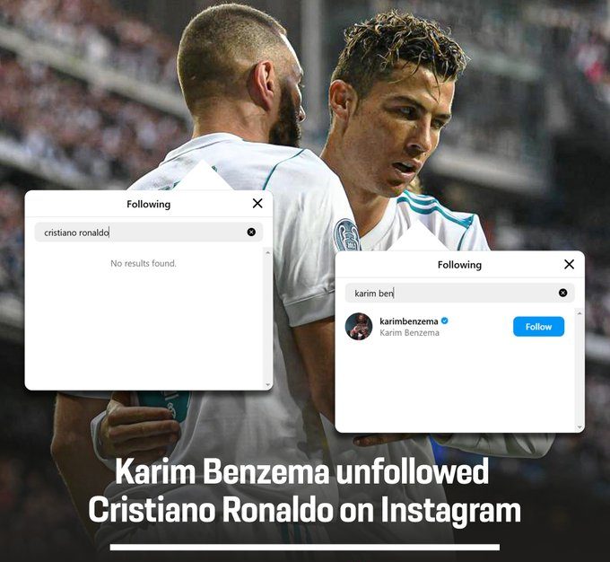 ويبدو أن الثنائي اللذين كانا زميلين مقربين في فريق ريال مدريد، أصبحا الآن صديقين بعيدين، ومع ذلك لا يزال رونالدو يتابع بنزيما على تطبيقات التواصل الاجتماعي، ويبدو أن هذه مشكلة خطيرة بالنظر إلى أن كلا اللاعبين شكلا شراكة ممتازة في ريال مدريد وأصبحا من نجوم النادي بلا منازع.
