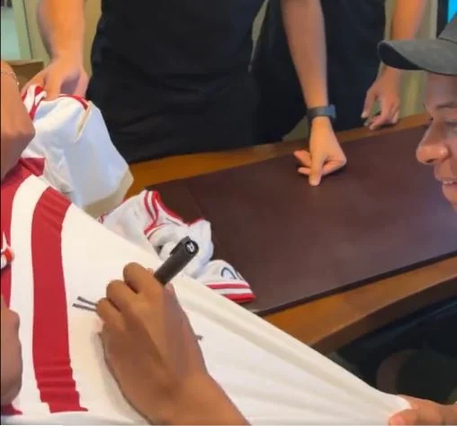 ظهر النجم الفرنسي “كيليان مبابي” لاعب نادي باريس سان جيرمان في فيديو أثناء توقيعه على قميص نادي الزمالك، بطلب من أحد مشجعي الفريق الأبيض، الذي نشر الصورة عبر حسابه.