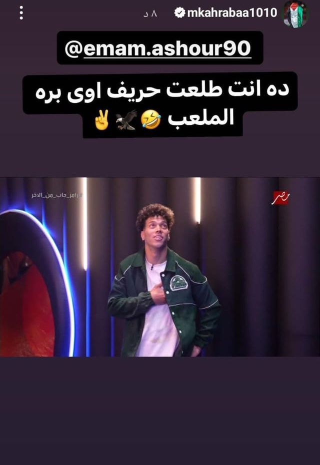علق النجم “محمود عبدالمنعم كهربا” مهاجم النادي الأهلي على ظهور زميله “إمام عاشور” نجم الأهلي مع رامز جلال في برنامجه التلفزيوني “رامز جاب من الآخر “.