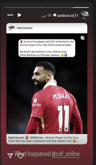 أحدث السنغالي “نيكولاس جاكسون” لاعب نادي تشيلسي الإنجليزي ضجة داخل أروقة الاتحاد الإفريقي لكرة القدم “كاف” بسبب عدم تواجد المصري “محمد صلاح” نجم ليفربول الإنجليزي، في قائمة المرشحين لجائزة أفضل لاعب إفريقي هذا العام.