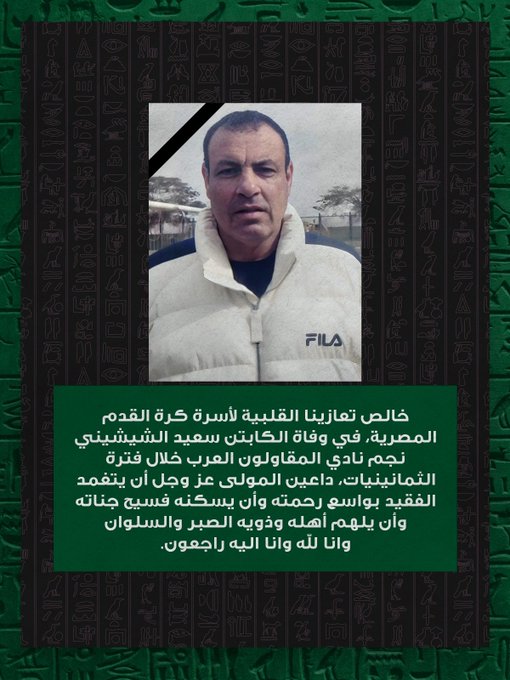 وقال نادي المقاولون العرب عبر حسابه الرسمي على موقع التواصل الاجتماعي “فيسبوك”: “ينعي نادي المقاولون العرب بكل حزن نجمه التاريخي وقائد فريق الكرة ورمزها بالنادي، فإنه يتقدم بخالص العزاء لأسرة الفقيد وكل محبيه، داعين المولى عز وجل أن يتغمده بواسع رحمته، وأن يلهم الأسرة الصبر والسلوان، وإنا لله وإنا إليه راجعون”.