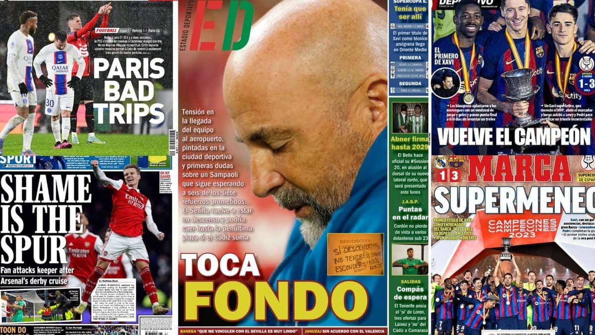 سلطت الصحف الرياضية العالمية اليوم الأثنين 16 يناير الضوء عن تتويج برشلونة بكأس السوبر الإسباني بعد الفوز في النهائي على ريال مدريد، وتعادل أتلتيكو مدريد أمام ألميريا بالدوري الإسباني، وفوز آرسنال على توتنهام وابتعاده في صدارة ترتيب الدوري الإنجليزي، وخسارة باريس أمام رين بالدوري الفرنسي.