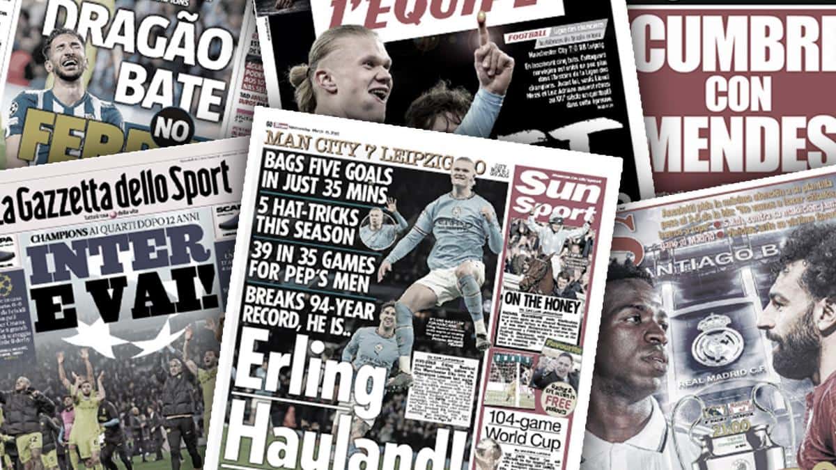سلطت الصحف الرياضية العالمية اليوم الأربعاء 15 مارس الضوء عن فوز مانشستر سيتي على لايبزيغ وتأهله لربع نهائي دوري أبطال أوروبا، وتأهل إنتر ميلان لدور الثمانية في دوري أبطال أوروبا، ومباراة اليوم بين ريال مدريد وليفربول في إياب دور الـ16 من دوري أبطال أوروبا، وتطورات قضية برشلونة ونيجريرا.