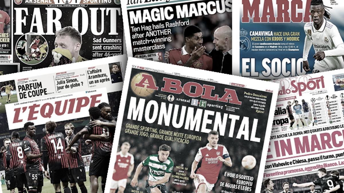 سلطت الصحف الرياضية العالمية اليوم الجمعة 17 مارس الضوء عن تأهل مانشستر يونايتد لربع نهائي الدوري الأوروبي، وإقصاء أرسنال أمام سبورتنيج لشبونة من دور الـ16، وإعلان المدرب جاريث ساوثجيت، مدرب منتخب إنجلترا، عن قائمة “الأسود الثلاثة” لتصفيات يورو 2024.