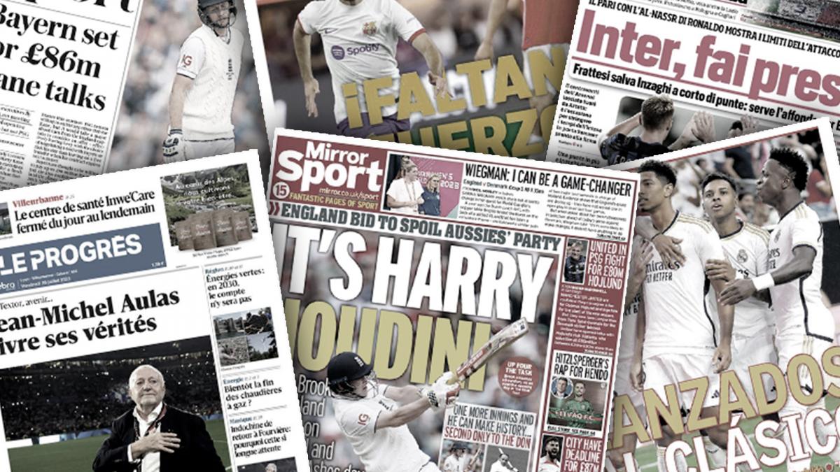 سلطت الصحف الرياضية العالمية اليوم الجمعة 28 يوليو 2023 الضوء عن فلورنتينو بيريز رئيس ريال مدريد الذي يسعر بالغضب من ممثلي كيليان مبابي نجم باريس سان جيرمان، وباريس لايزال في سباق التعاقد مع هاري كين، واليويفا يحسم مصير برشلونة من المشاركة بدوري الأبطال.