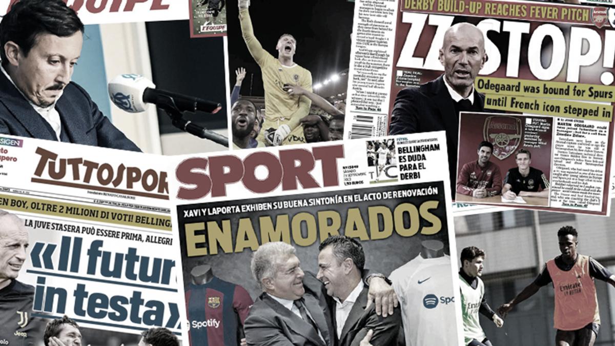 سلطت الصحف الرياضية العالمية اليوم السبت 23 سبتمبر الضوء علي نادي برشلونة الذي جدد عقد مدربه تشافي هيرنانديز حتى عام 2025، وإقتراب عودة ثنائي ريال مدريد أردا جولر وفينيسيوس، ويوفنتوس متمسك بعدم دفع أي أموال لـ البرتغالي كريستيانو رونالدو، وملاك إنتر ميلان يرغبون بيع النادي.