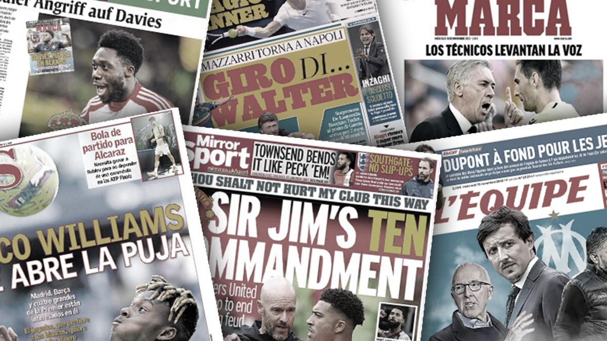 سلطت الصحف الرياضية العالمية اليوم الأربعاء 15 نوفمبر الضوء علي غضب المدرب الإيطالي كارلو أنشيلوتي المدير الفني لريال مدريد في اجتماع الحكام، وتعيين ماتزاري مدرباً جديداً لنادي نابولي، وموقف برشلونة من عودة أنسو فاتي بعد إنتهاء فترة إعارته.