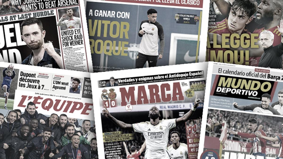 ونشرت الصحيفة الإسبانية عن فوز ريال مدريد 1/0 أمام ريال مايوركا بصعوبة في الدوري الإسباني وكتبت: “​روديجيز​ يمنح الريال الفوز ولقب بطل الشتاء”، كما أهتمت الصحيفة بفوز جيرونا 4/3 أمام أتلتيكو مدريد في مباراة مثيرة بالدوري الإسباني وكتبت: “​جيرونا​ يتفوق على الأتلتيكو ويواصل الضغط”.