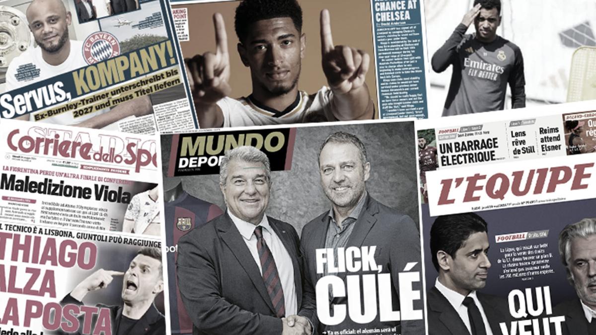 سلطت الصحف الرياضية العالمية اليوم الخميس 30 مايو الضوء علي تصريحات جود بيلينجهام عن نهائي دوري أبطال أوروبا، وهانز فليك مديراً فنياً لنادي برشلونة، مفاوضات من أجل تجديد عقد المدرب ميكيل أرتيتا، ونادي يوفنتوس يوجه رسالة وداعية لأسطورة النادي ليوناردو بونوتشي الذي أكد اعتزاله كرة القدم.