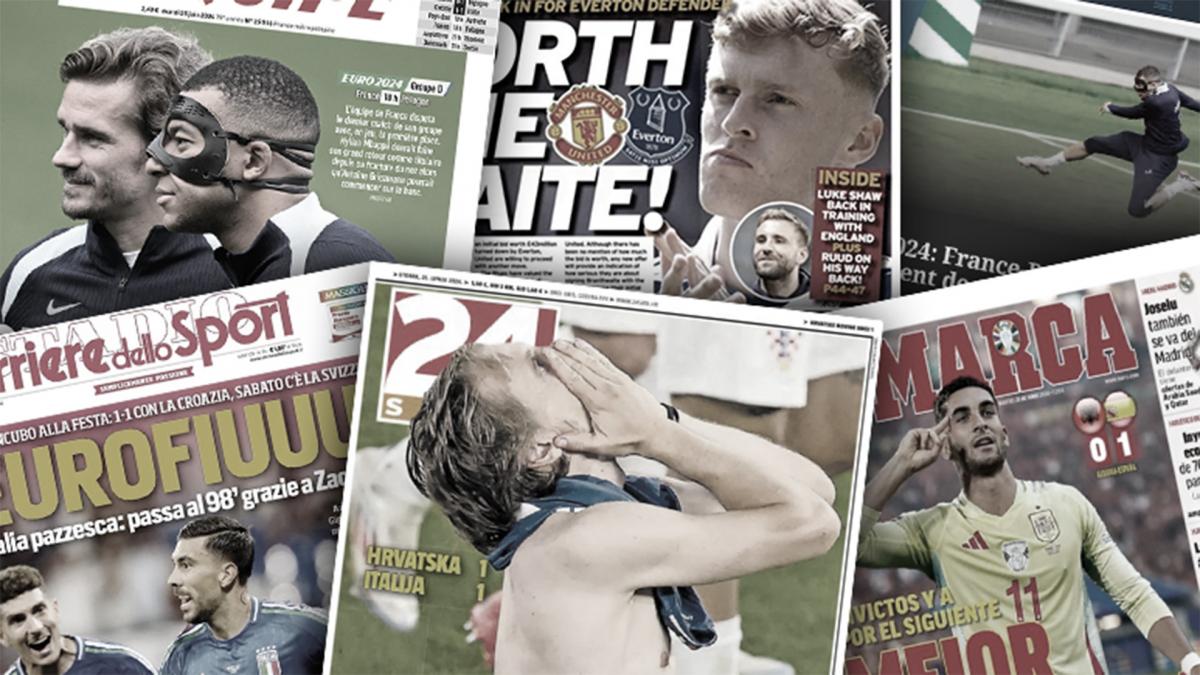 سلطت الصحف الرياضية العالمية اليوم الثلاثاء 25 يونيو الضوء علي فوز إسبانيا علي ألبانيا، وتعادل إيطاليا أمام كرواتيا في مباراة مثيرة يورو 2024، وخوسيلو قرر الرحيل عن ريال مدريد، ومباريات اليوم باليورو: فرنسا أمام بولندا، وإنجلترا تواجه سلوفينيا.
