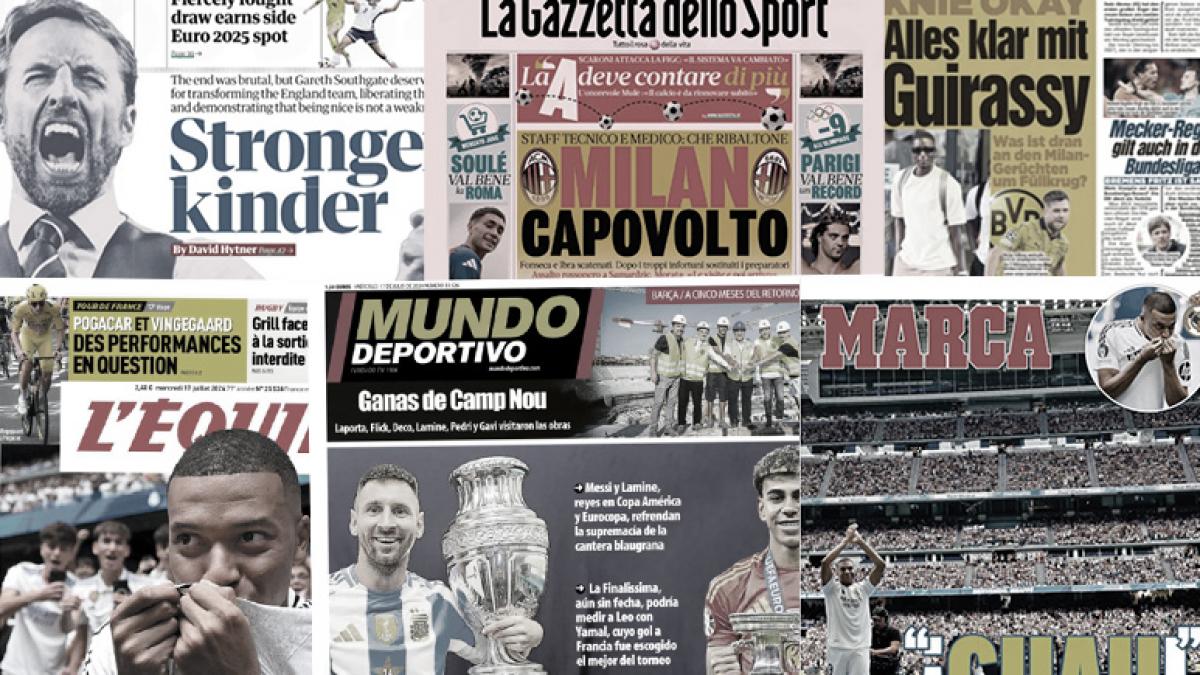 سلطت الصحف الرياضية العالمية اليوم الأربعاء 17 يوليو الضوء علي تقديم النجم كيليان مبابي كلاعب رسمياً لنادي ريال مديد وسط حصور جماهيري كبير، والاتحاد الأوروبي لكرة القدم يعلن عن التشكيل المثالي لبطولة يورو 2024، واللاعب ترينت ألكسندر أرنولد يفكر في الرحيل عن ليفربول، وجاريث ساوثجيت يستقيل من تدريب منتخب إنجلترا.