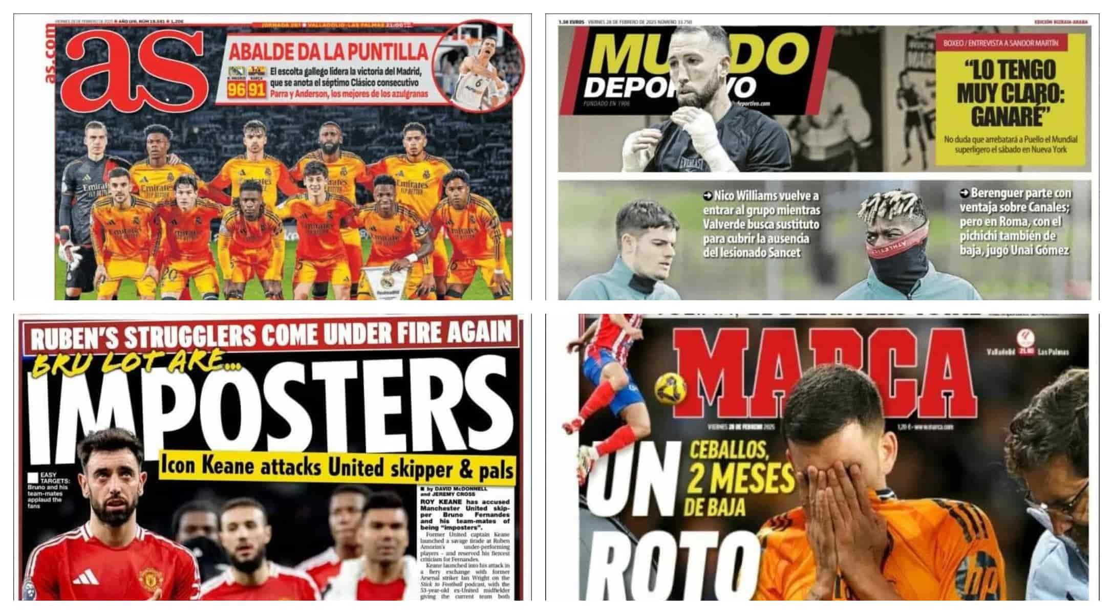 سلطت الصحف الرياضية العالمية اليوم الجمعة 28 فبراير الضوء علي إصابة داني سيبايوس لاعب خط وسط ريال مدريد والذي سيغيب علي أثرها لمدة شهرين، ومدرب منتخب بلجيكا يؤكد أن تيبو كورتوا حارس مرمى ريال مدريد سيعود إلى صفوف المنتخب في مارس، والنيجيري فيكتور أوسيمين يرغب في الانتقال إلى مانشستر يونايتد خلال الموسم الجديد.
