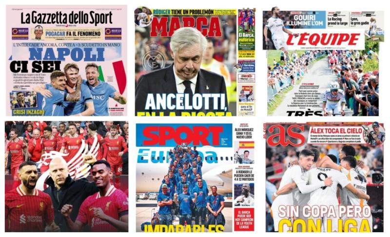 سلطت الصحف الرياضية العالمية اليوم الأثنين 28 إبريل الضوء علي مستقبل كارلو أنشيلوتي مع ريال مدريد وذلك بعد خسارة كأس ملك إسبانيا، وتتويج ليفربول رسمياً بطلاً للدوري الإنجليزي، ومشجعو باريس سان جيرمان يشعرون بتفاؤل كبير قبل مباراة نصف نهائي دوري أبطال أوروبا أمام أرسنال.