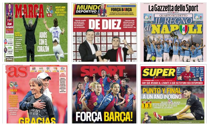 ونشرت الصحيفة الإسبانية عن تأكيد رحيل المدرب الإيطالي كارلو أنشيلوتي من ريال مدريد وكتبت: “وداع أنشيلوتي”، كما أهتمت الصحيفة بإستعداد ديكو وهانزي فليك للموسم المقبل حيث يعمل برشلونة على تعزيز صفوفه في الموسم المقبل وكتبت: “أزمة في ميركاتو برشلونة”.