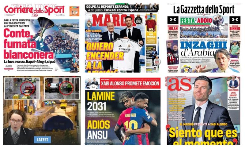 سلطت الصحف الرياضية العالمية اليوم الثلاثاء 27 مايو 2025 الضوء علي نادي ريال مدريد الذي أعلن رسمياً تعيين المدرب تشابي ألونسو، وكارلو أنشيلوتي يبدأ مهامه مع منتخب البرازيلي، وسائق يدهس عدداً من مشجعي ليفربول خلال إختفال التتويج.