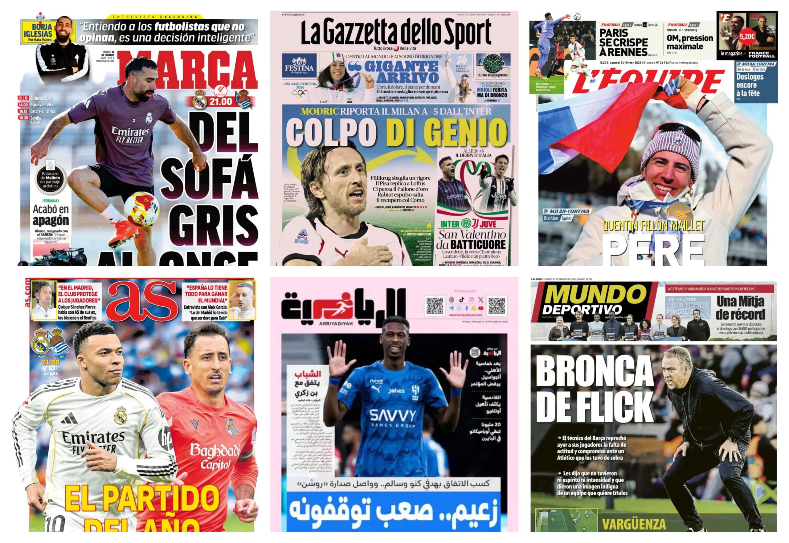 سيطرت أحداث الدوري الإسباني وتداعيات سقوط باريس سان جيرمان الفرنسي على واجهات الصحف الرياضية العالمية الصادرة صباح اليوم السبت 14 فبراير 2026، كما خطفت أخبار عودة الأسطورة كريستيانو رونالدو لصفوف النصر واهتزاز مقاعد المدربين في إنجلترا والشباب السعودي حيزاً واسعاً من الاهتمامات.