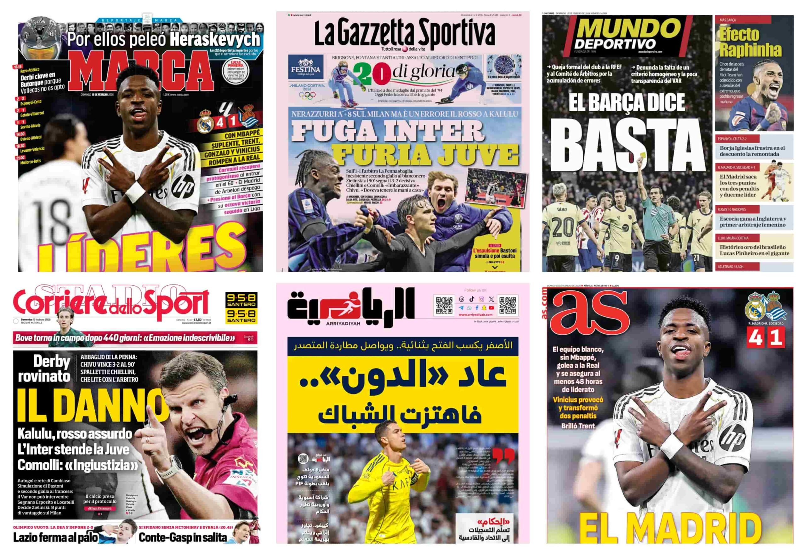 تصدرت انتصارات الأندية الكبرى وعودة النجوم للتألق العناوين الرئيسية للصحف الرياضية العالمية الصادرة صباح اليوم الأحد 15 فبراير 2026 فبينما أحكم ريال مدريد قبضته على قمة الليغا “مؤقتاً”، كان محمد صلاح يقود ليفربول لعبور جديد في كأس الاتحاد الإنجليزي، في حين استعاد كريستيانو رونالدو لغة الأهداف في الملاعب السعودية، كما لم تخلُ الصحف من الجدل التحكيمي الذي أثاره نادي برشلونة، وأزمات النجوم في الدوري الإنجليزي.