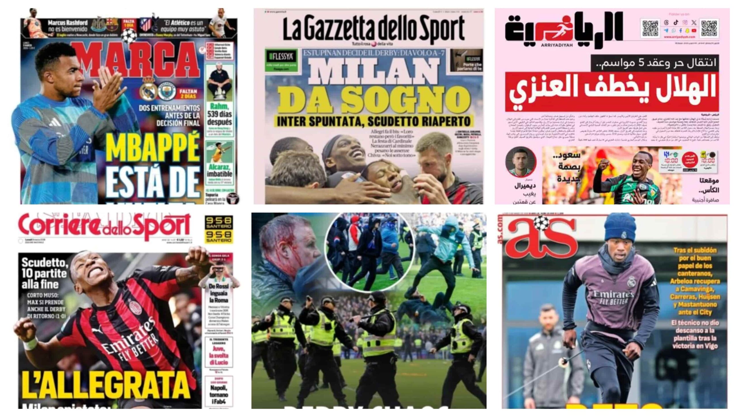 شهدت أغلفة الصحف الرياضية العالمية فوز ميلان بديربي الغضب لصالحه، مما أعاد إشعال الصراع على لقب الدوري الإيطالي، بينما تترقب الجماهير المدريدية عودة نجمها الأول كيليان مبابي لمواجهة مانشستر سيتي، وفي كتالونيا تتجه الأنظار نحو المناظرة الرئاسية الأولى، في حين سجل النجم السعودي سعود عبد الحميد حضوراً تاريخياً في الملاعب الفرنسية.