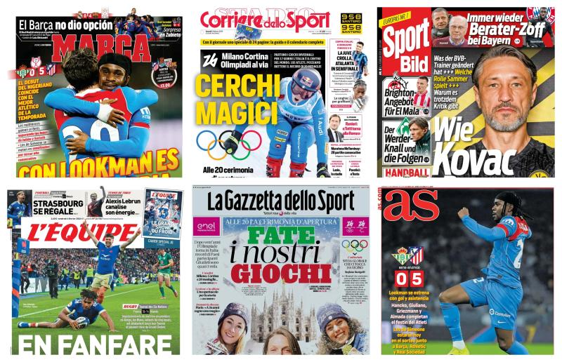 تشهد الساحة الرياضية الأوروبية اليوم الجمعة أحداثاً استثنائية، حيث تصدرت الصحف أخبار انطلاق الألعاب الأولمبية الشتوية في وقت عصفت فيه النتائج غير المتوقعة بكبار أندية كرة القدم في القارة العجوز، من زلزال تورينو إلى هيمنة كاتالونيا المطلقة في إسبانيا.