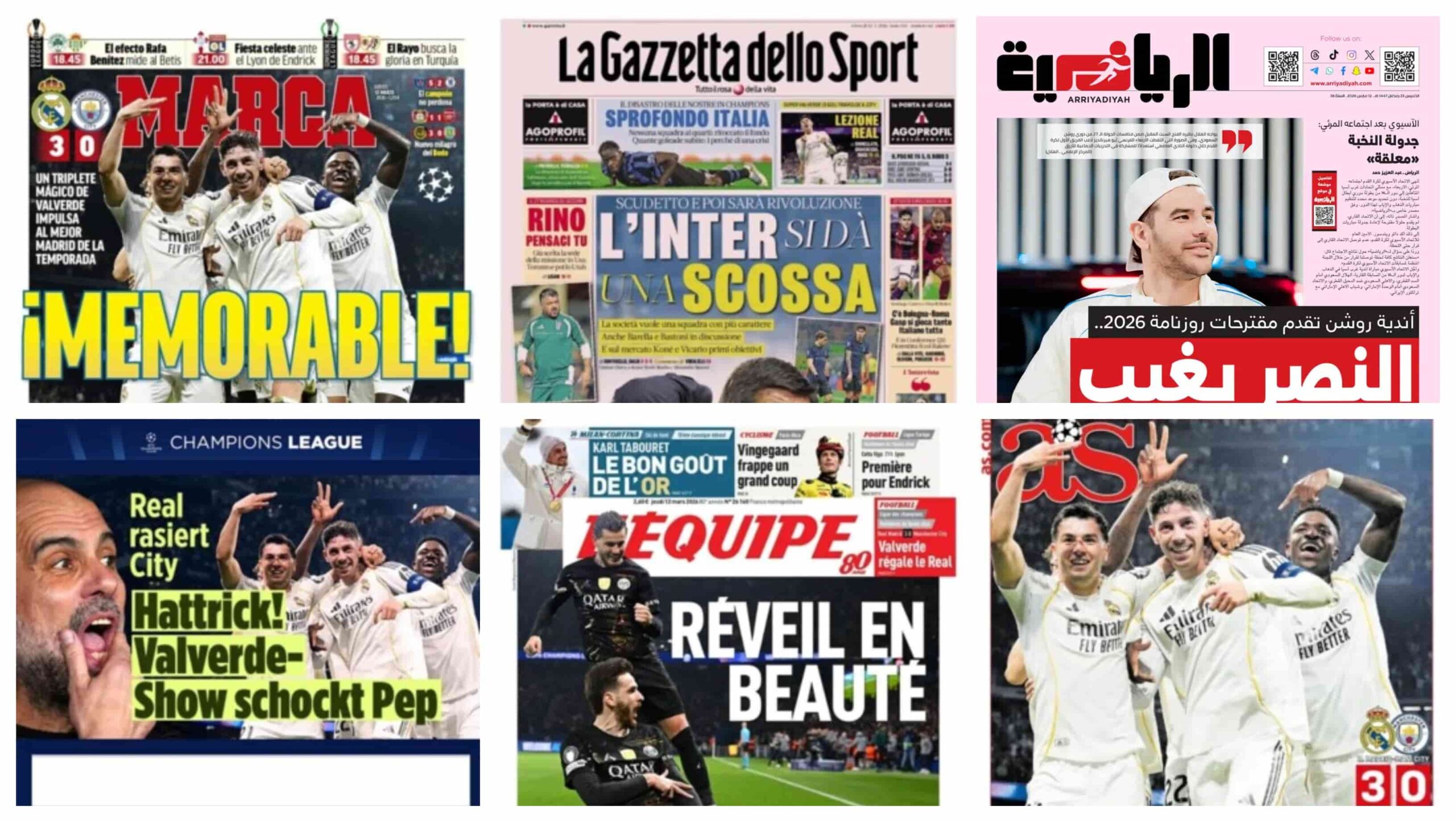 نشرت الصحف الرياضية العالمية الصادرة اليوم عن ليلة دوري أبطال أوروبا، حيث نصّب الأوروغواياني فيديريكو فالفيردي نفسه ملكاً على “سانتياغو برنابيو” بتدمير مانشستر سيتي بثلاثية، بينما استعرض باريس سان جيرمان قوته الهجومية أمام تشيلسي، وفي السعودية تترقب الأندية حسم الجدولة القارية بينما يواصل الهلال استعادة نجومه، وسط حالة من الترقب لعودة المحارب غافي للملاعب الإسبانية.
