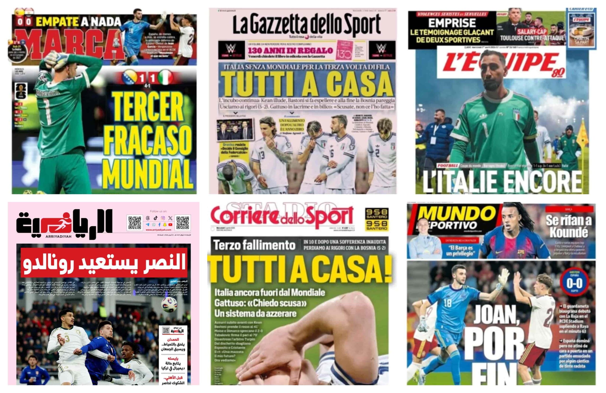 أبرز عناوين أغلفة الصحف العالمية: “إيطاليا خارج المونديال للمرة الثالثة تواليا وسقوط تاريخي للإنجليز”