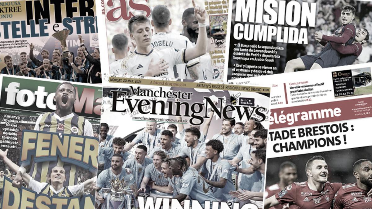 سلطت الصحف الرياضية العالمية اليوم الأثنين 20 مايو الضوء علي تعادل ريال مدريد أمام فياريال، وبرشلونة يفوز علي رايو فاليكانو في الدوري الإسباني، ومانشستر سيتي يفوز علي وست هام ويحرز اللقب ويدخل التاريخ، وإنتر ميلان يتعادل أمام لاتسيو ويحتفلوا بلقب أبطال الدوري الإيطالي.