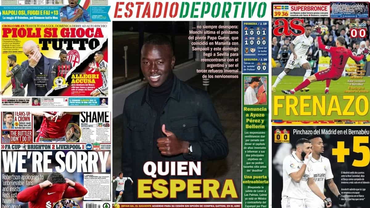 سلطت الصحف الرياضية العالمية اليوم الأثنين 30 يناير الضوء عن تعادل ريال مدريد أمام ريال سوسيداد في الدوري الإسباني، وفوز أتلتيكو مدريد على أوساسونا، وفترة غياب عثمان ديمبلي عن برشلونة، وإقصاء ليفربول من كأس الاتحاد الإنجليزي بالخسارة أمام برايتون، وخسارة ميلان أمام ساسولو، وأيضاً خسارة يوفنتوس أمام مونزا بالدوري الإيطالي.