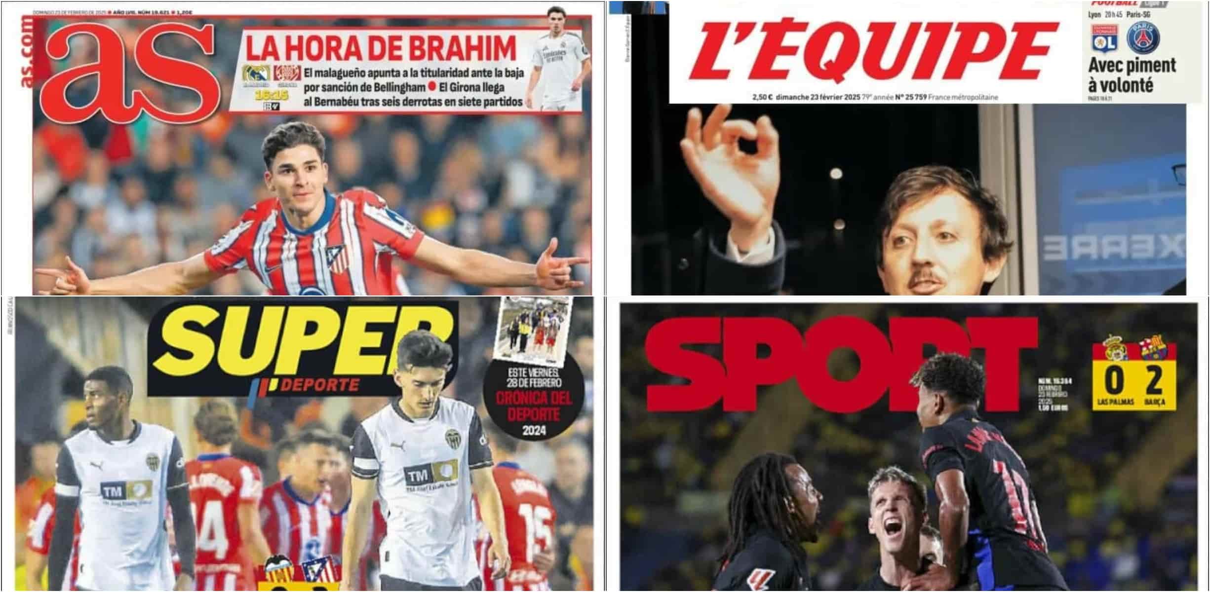 سلطت الصحف الرياضية العالمية اليوم الأحد 23 فبراير الضوء علي فوز برشلونة علي لاس بالماس ليعزز صدارته في الدوري الإسباني، وريال مدريد يواجه اليوم جيرونا في الدوري الإسباني، وأرسنال يخسر أمام وست هام بالدوري الإنجليزي، وإنتر ميلان يخطف فوز مثير أمام جنوي بالدوري الإيطالي.