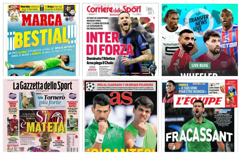 أستحوذت الأحداث الكبرى المنتظرة هذا اليوم على عناوين الصحف الرياضية في القارة العجوز، حيث تتجه الأنظار نحو أخبار التنس (بطولة أستراليا المفتوحة)، وسوق الانتقالات الشتوية المشتعل قبل إغلاقه، وبعض المفاجآت في دوري السلة الأمريكي NBA والدوريات الأوروبية.