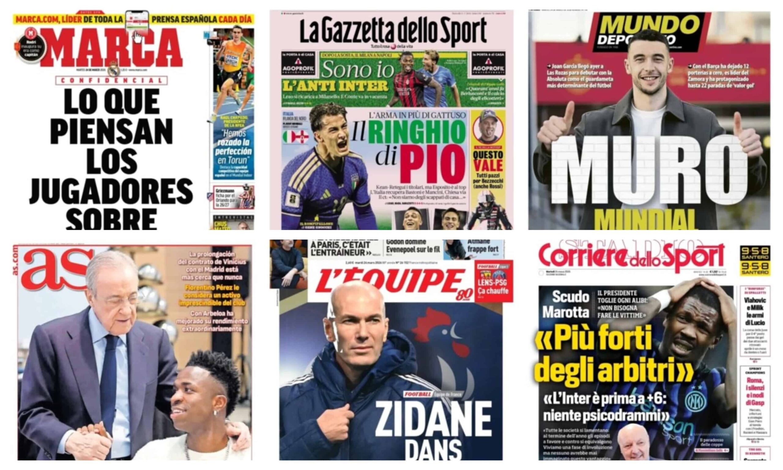 أتجهت أغلفة الصحف الرياضية العالمية اليوم الثلاثاء 24 مارس إلي أجواء التحضيرات النهائية لكأس العالم 2026 وترتيبات البيت الداخلي لكبار الأندية الأوروبية على المشهد الرياضي العالمي اليوم، وبينما تنشغل المنتخبات الوطنية برسم ملامح القوائم النهائية، تشتعل ملفات التجديد والتعاقدات في أروقة ريال مدريد وبرشلونة، وتتصاعد حدة التصريحات في الدوري الإيطالي مع اقتراب المنعطف الأخير من الموسم.