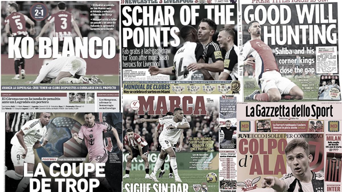 سلطت الصحف الرياضية العالمية اليوم الجمعة 6 ديسمبر الضوء علي قرعة كأس العالم للأندية 2025 والتي ستقام في الولايات المتحدة الأمريكية، وجوارديولا يستهدف برونو جيمارايش نجم وسط نيوكاسل يونايتد، وتوتنهام يخسر أمام بورنموث بالدوري الإنجليزي.