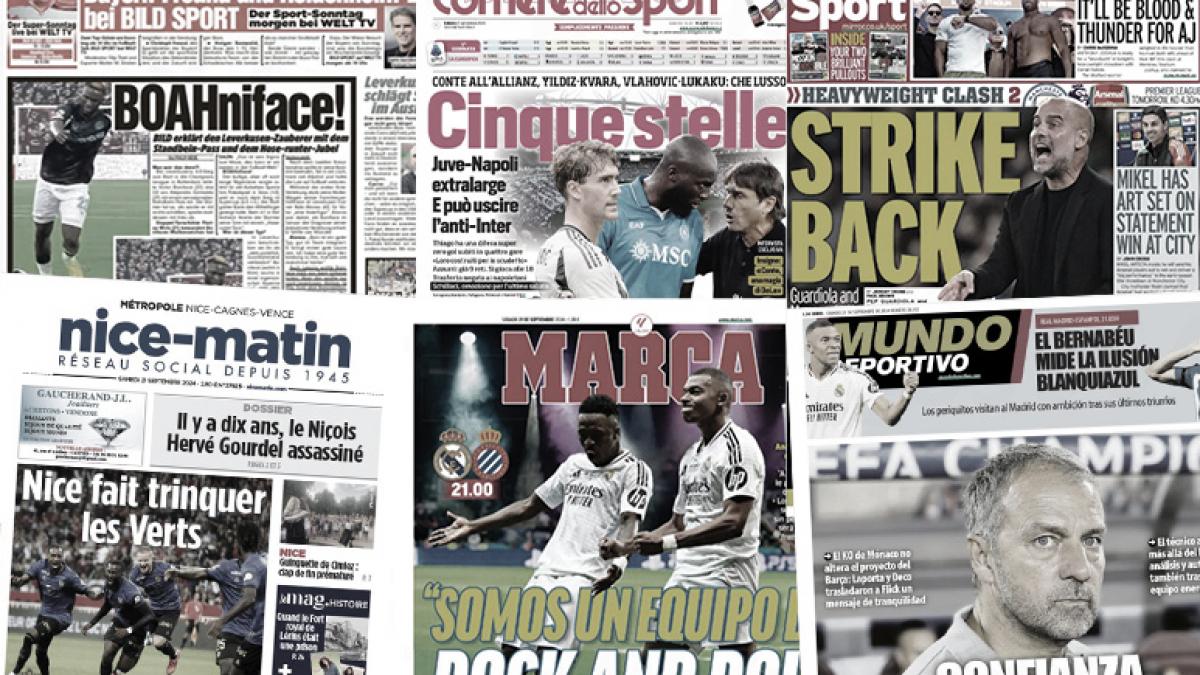 سلطت الصحف الرياضية العالمية اليوم السبت 21 سبتمبر الضوء علي مباراة ريال مدريد أمام إسبانيول اليوم بالدوري الإسباني والتي ستشهد غياب 4 لاعبين، وتعرض دي بروين لإصابة قوية أثناء مواجهة إنتر ميلان بدوري الأبطال، ولاعبي نادي روما غاضبون بسبب إقالة المدرب دانييلي دي روسي.