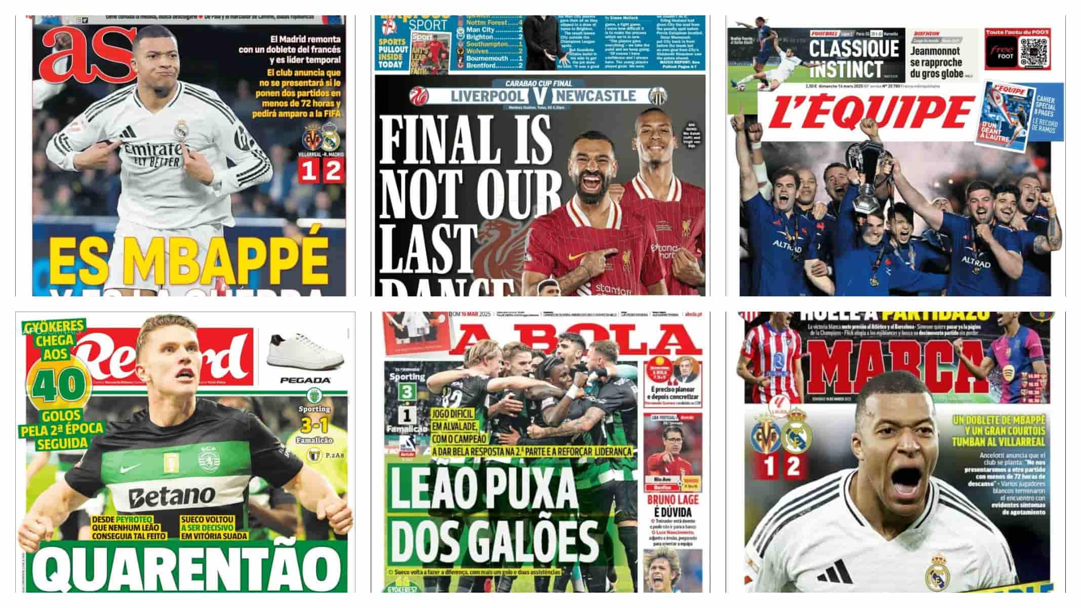 سلطت الصحف الرياضية العالمية اليوم الأحد 16 مارس الضوء علي تألق مبابي وإحرازه هدفين خلال فوز ريال مدريد علي فياريال في الدوري الإسباني، وبرشلونة يواجه أتلتيكو مدريد اليوم من أجل إستعادة الصدارة، وتشيلسي يتوصل إلى اتفاق مع نادي سبورتنج لشبونة لضم أحد نجومه الصاعدين داريو إيسوجو، وإيرلينج هالاند يصل إلى المساهمة التهديفية رقم 100 في مسيرته بالدوري الإنجليزي.