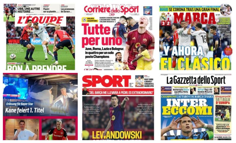 ونشرت الصحيفة الإسبانية عن فوز ريال مدريد 3/2 علي سيلتا فيغو في الجولة 34 من منافسات الدوري الإسباني قبل الكلاسيكو وكتبت: “ريال مدريد 3-2 سيلتا فيغو.. والآن الكلاسيكو”، كما أهتمت الصحيفة باللاعب ليفاندوفيسكي الذي يسعي للمشاركة أمام إنتر ميلان بإياب نصف نهائي دوري الأبطال وكتبت: “ليفاندوفسكي يستهدف الانتر.. تدرب البولندي مع المجموعة وسيتم ضمه الى تشكيلة فليك”.