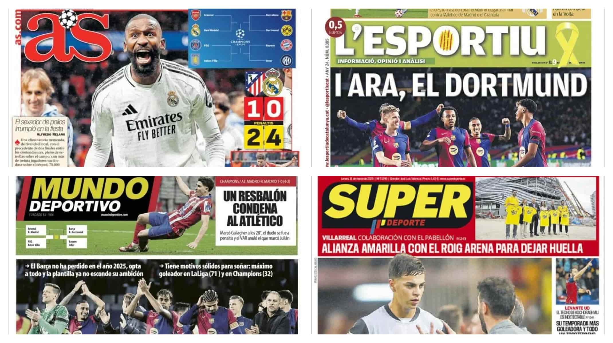 ونشرت الصحيفة الإسبانية عن تأهل ريال مدريد إلي ربع نهائي دوري أبطال أوروبا علي حساب أتلتيكو مدريد بركلات الترجيح وكتبت: “شيء مذهل.. ريال مدريد يتأهل بضربات الترجيح امام الاتلتيكو”، كما أهتمت الصحيفة بالنجم الفرنسي كيليان مبابي الذي ندم على ترك ركلة الجزاء التي احتسبت خلال مباراة فريقه ضد أتلتيكو مدريد في دوري أبطال أوروبا وكتبت: “ندم مبابي”.