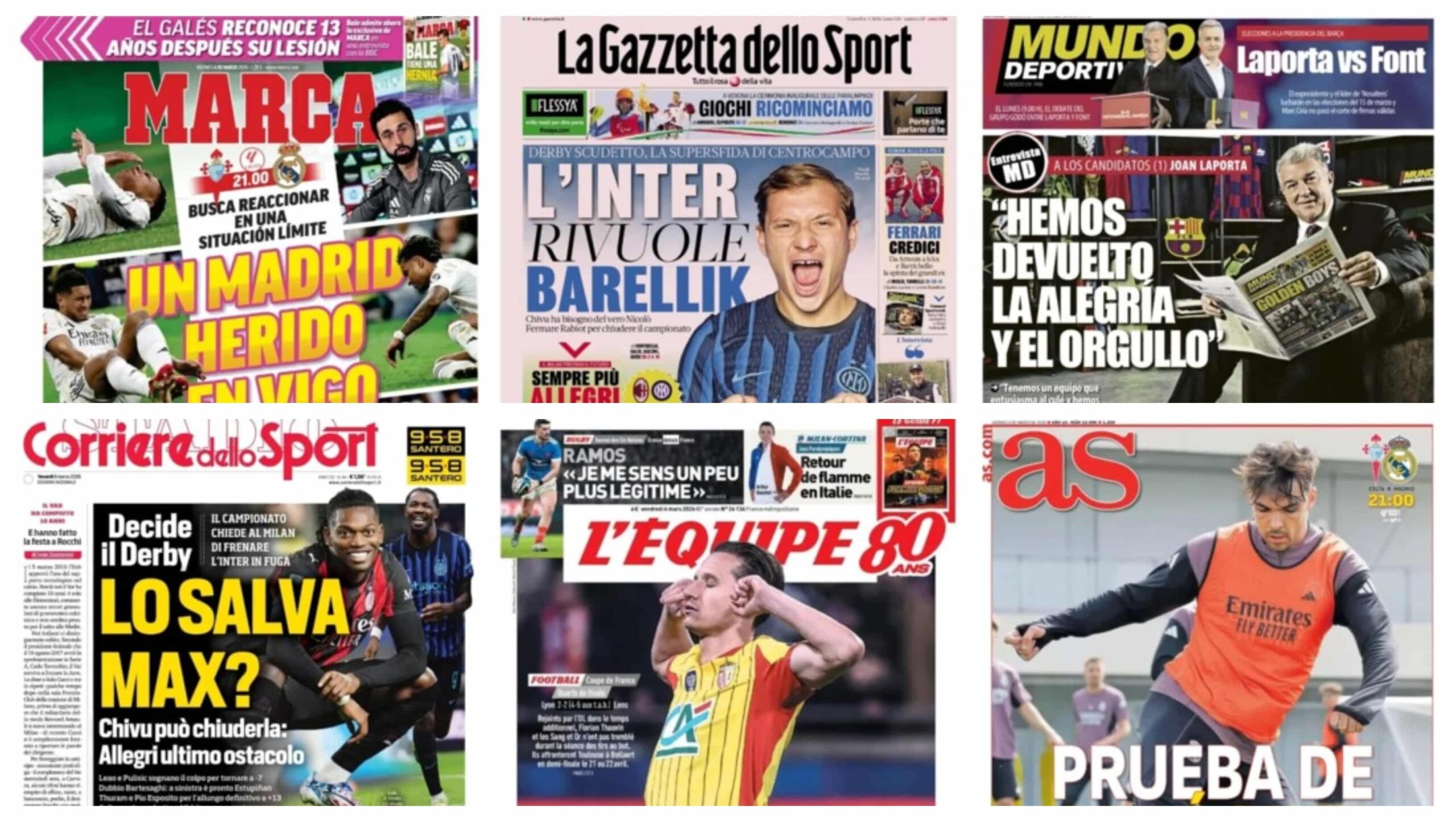 تصدرت أغلفة الصحف العالمية حول استعادة ريال مدريد نغمة الانتصارات بشق الأنفس في الوقت القاتل، بينما نجح ليفربول في الثأر بكأس الاتحاد الإنجليزي، وفي الملاعب العربية، حسم الأهلي ديربي جدة ببراعة ليعتلي صدارة الدوري السعودي مؤقتا، وسط ترقب كبير لمواجهة القمة بين برشلونة وأتلتيك بلباو.