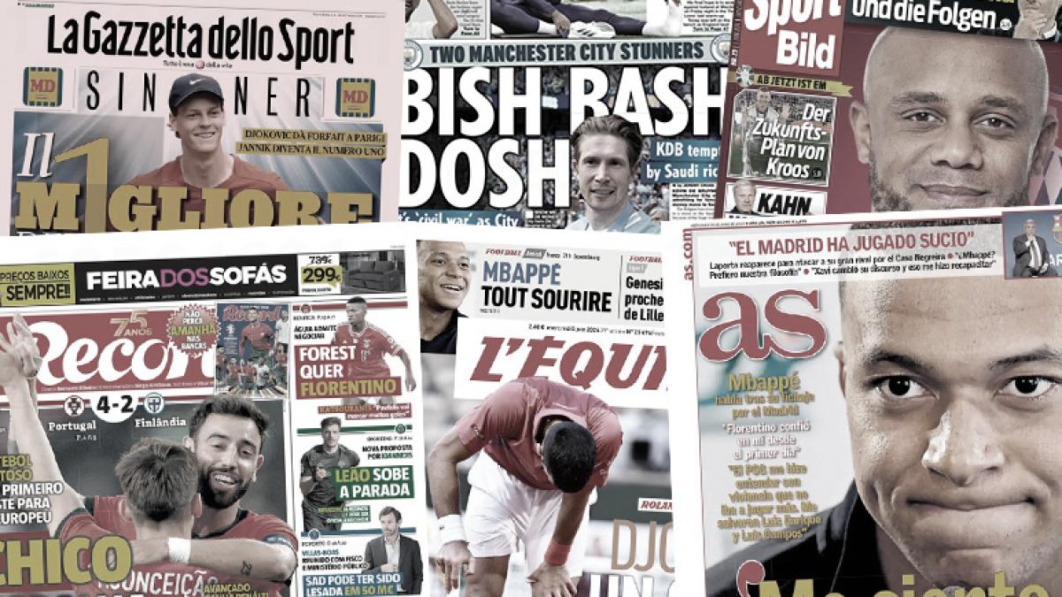 سلطت الصحف الرياضية العالمية اليوم الأربعاء 5 يونيو الضوء علي تصريحات مبابي بعد إنضمامه لنادي ريال مدريد، ونادي مانشستر سيتي سيتخذ إجراءات قانونية غير مسبوقة ضد الدوري الإنجليزي، وتطورات مستقبل دي بروين مع مانشستر سيتي، وخوان لابورتا رئيس نادي برشلونة غاضب من تصريحات ضد ريال مدريد على خلفية قضية نيجريرا.