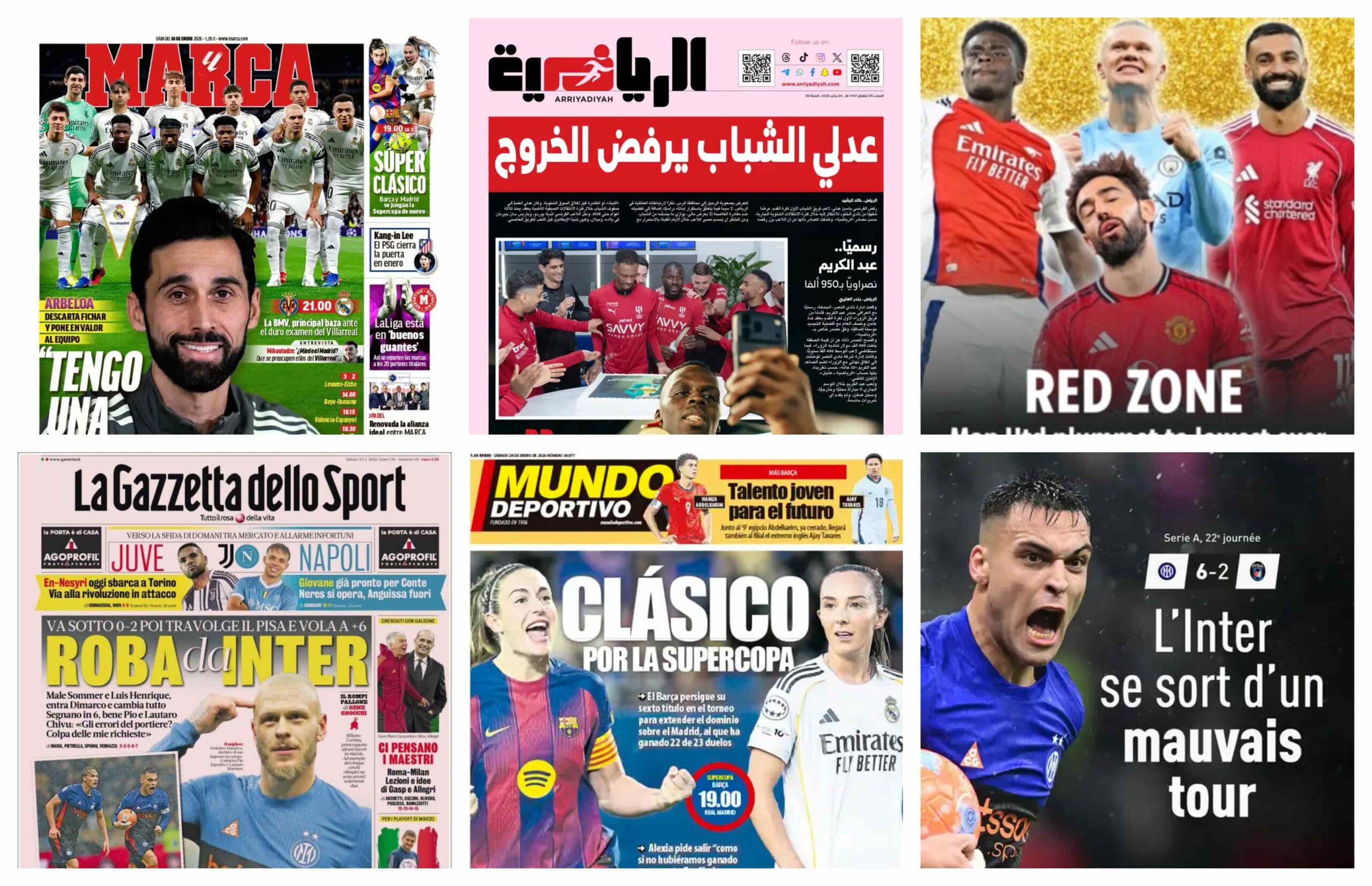 تصدرت المواجهات الحاسمة في الدوريات الأوروبية الكبرى، والتحركات المبكرة في سوق الانتقالات، عناوين الصحف الرياضية العالمية الصادرة صباح اليوم، السبت 24 يناير 2026، وجاءت قمة فياريال وريال مدريد في الليجا، في مقدمة اهتمامات الصحافة الإسبانية، بينما فجرت الصحف الإنجليزية مفاجأة بشأن رغبة آرسنال في ضم بطل العالم جوليان ألفاريز، وفي الشأن المحلي، سلطت الصحف الضوء على صفقات النصر والشباب الشتوية.