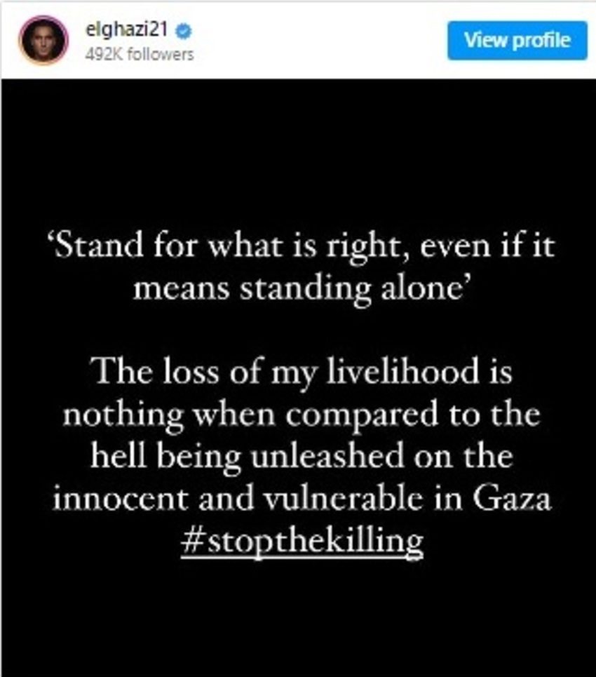 ورد أنور الغازي عبر صفحته الرسمية على موقع التواصل الإجتماعي “إنستجرام” بعد إعلان ماينز فسخ التعاقد وقال: “قف بجانب ما هو صحيح، حتى لو كان ذلك يعني الوقوف بمفردك، إن خسارة مصدر رزقي لا شيء بالمقارنة مع الجحيم الذي أطلق العنان له على الأبرياء والضعفاء في غزة.. أوقفوا القتل”.