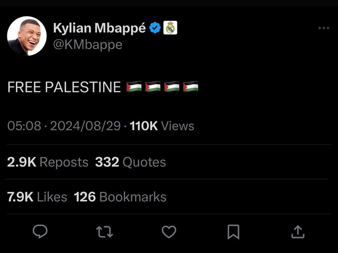 ومن أبرز التغريدات التي نُشرت عبر الحساب المخترق كانت تغريدة تضامن مع فلسطين جاء فيها: “فلسطين حرة”، ولحسن الحظ أستطاع مبابي استعادة حسابه على “إكس” وحذف جميع التغريدات غير المناسبة قبل ساعات قليلة من مباراة فريقه ضد لاس بالماس في بطولة الدوري الإسباني.