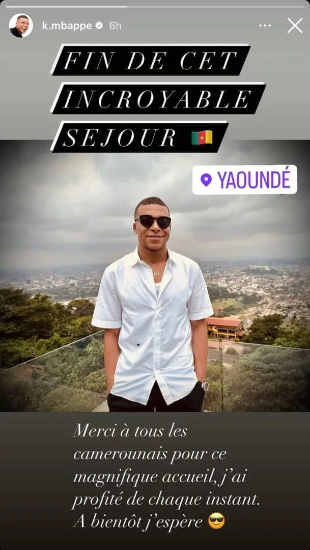 وعبر الحساب الرسمي لكليان مبابي وخاصةً علي قصص إنستجرام نشر رسالة شكر للشعب الكاميروني قائلاً: “شكراً لجميع الكاميرونيين على هذا الترحيب الرائع، لقد استغلت كل لحظة، وآمل أن نراكم قريبا”، وأخيرًا نحت في انتظار معرفة المزيد عن مستقبله، ومن المتوقع أن يستأنف قائد المنتخب الفرنسي التدريبات مع باريس سان جيرمان في الأيام المقبلة.