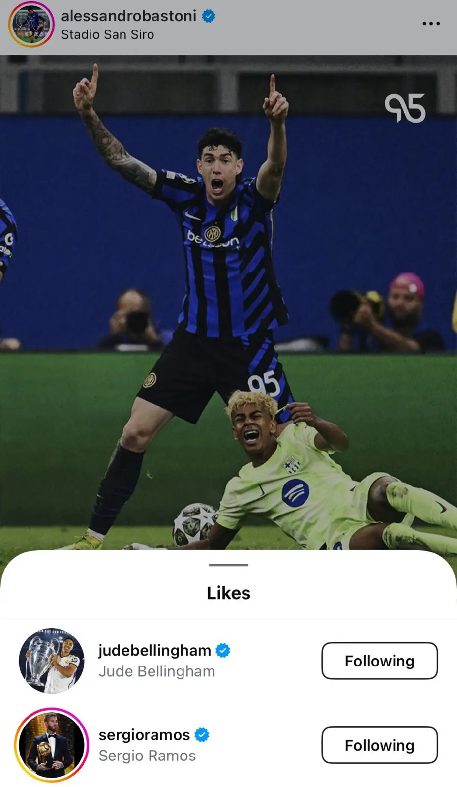 أحدث جود بيلينجهام، نجم ريال مدريد، ضجة كبيرة بين الجماهير عبر وسائل التواصل الاجتماعي بعدما أعرب عن إعجابه بمنشور أليساندرو باستوني، لاعب إنتر ميلان، بعد انتصار فريقه على برشلونة في المباراة التي أقيمت مساء أمس الثلاثاء ضمن نصف نهائي دوري أبطال أوروبا.