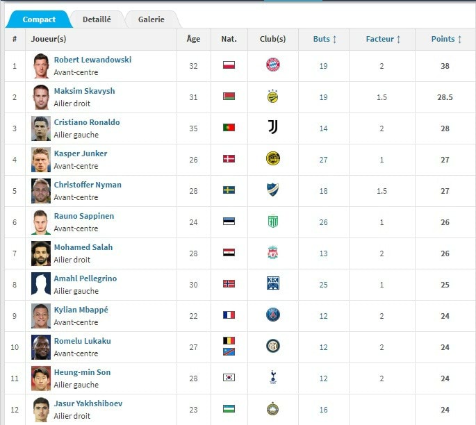 وتصدر ليفاندوفسكي مهاجم بايرن ميونيخ ترتيب الحذاء الذهبي الأوروبي كأفضل هداف في الدوريات الأوروبية مبكرا بعدما رفع رصيده من الأهداف في الدوري الألماني إلى 19 هدفا في 14 جولة فقط وحافظ رونالدو نجم يوفنتوس على فارق 5 أهداف مع ليفاندوفسكي بعد تسجيله هدفين أمس في مرمى أودينيزي.