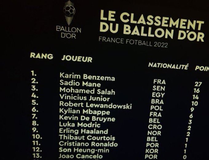 وقد كشفت الصورة المسربة عن الفائز بجائزة الكرة الذهبية بالإضافة إلى ترتيب العشرة الأوائل، وكشفت الصورة أن النجم الفرنسي كريم بنزيما لاعب نادي ريال مدريد هو الفائز بجائزة الكرة الذهبية لأفضل لاعب في العالم عام 2022 بعد حصوله على (27 نقطة)، فيما جاء النجم السنغالي “ساديو ماني” لاعب ليفربول السابق وبايرن ميونيخ الحالي في المركز الثاني بحصوله علي (16 نقطة)، بينما جاء المصري “محمد صلاح” ثالثاً بحصوله علي (14 نقطة).