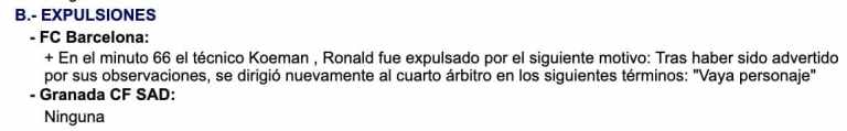 وكشف مصدر الذي سرب صورة من تقرير الحكم الذي أدار مواجهة برشلونة وغرناطة عن واقعة طرد كومان فإنه لم يحترم الحكم الرابع قائلًا: ” يالها من شخصية” وأنه من المتوقع أن يتم معاقبة كومان بإيقافه ما بين مباراة إلى 3 مباريات إلا أنه قد تأكد غيابه عن لقاء فالنسيا المقبل في الليجا.