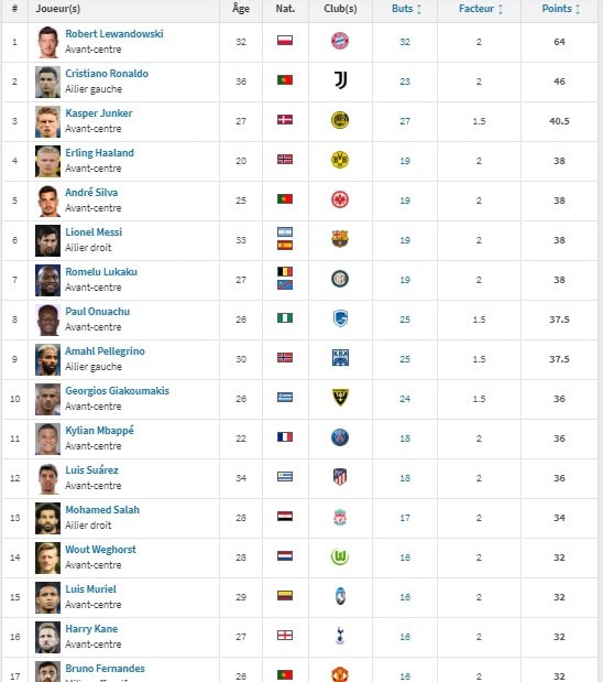 وصعد رونالدو لوصافة ترتيب الحذاء الذهبي الأوروبي برصيد 46 نقطة من 23 هدف وقلص الفارق عن المتصدر ليفاندوفسكي من 22 نقطة و11 هدفا إلى 18 نقطة و9 أهداف وقلص الفارق عن المتصدر “روبرت ليفاندوفسكي” الذي سجل لفريقه بايرن ميونيخ 32 هدف برصيد 64 نقطة بينما يقع ليونيل ميسي مهاجم برشلونة الإسباني في المركز السادس بـ38 نقطة من 19 هدف.