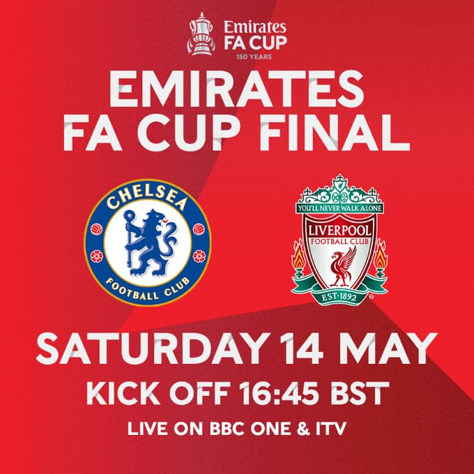 وأعلن الاتحاد الإنجليزي أن مباراة ليفربول وتشيلسي في نهائي كأس الاتحاد الإنجليزي، ستقام يوم 14 مايو القادم عند الساعة 6:45 مساءً بتوقيت السعودية والساعة 5:45 مساءً بتوقيت القاهرة، والساعة 4:45 مساءً بتوقيت بريطانيا، على أن تقام المباراة على ملعب “ويمبلي”.